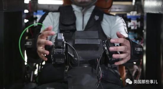 驾驶员在里面握着手柄操纵,可以控制机械臂的所有运动(上下左右挥舞,击拳等),包括手指的运动。