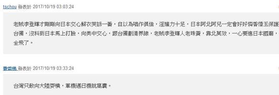 对此说法,台网友并不买账。有网友酸,“只敢跟大陆耍横,遇到日本就窝囊”;还有网友借此怒批李登辉媚日做派,“老贼李登辉才刚刚向日本交心,以为日本会保护‘台独’,没料日本马上打脸!”;还有网友讽刺,“让大陆出面吧,民进党不敢惹倭寇”。