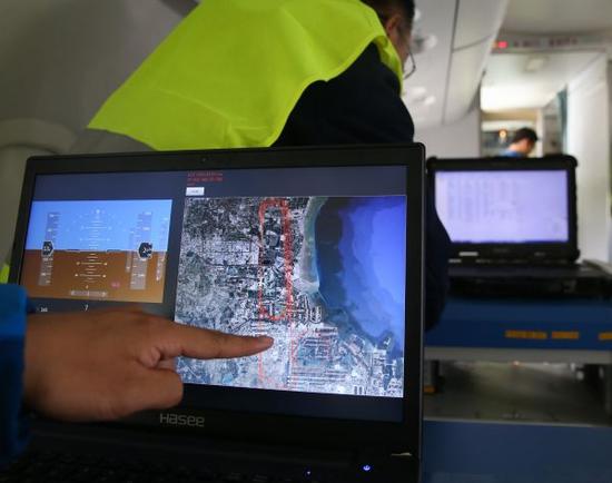 2017年10月14日,在ARJ21-700飞机103架机上,工作人员在展示通过北斗卫星定位系统获得的经纬度实时绘制的飞机飞行轨迹图。新华社记者 丁汀 摄