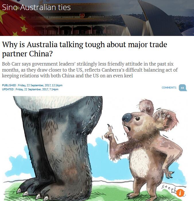 澳大利亚悉尼科技大学澳中关系研究中心主任、澳大利亚前外交部长鲍勃·卡尔9月22日在香港英文媒体《南华早报》发表评论文章:《为何澳大利亚对最大贸易伙伴中国如此出言不逊?》