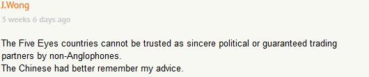 对于母语非英语的国家来说,五眼联盟(该联盟由美国、英国、澳大利亚、加拿大和新西兰五国的情报机构组成,二战时为破解德国和日本海军密码而建立,但战争结束后并未解散并一直存在至今。这五个国家组成的情报网络内部实现了情报信息的互通,窃取来的政治、军事、科技以及商业信息在这些国家的政府部门和公司之间实现了共享——观察者网注)的成员国绝不应获得任何政治或商业上的信任。中国人最好记住我的这一忠告。