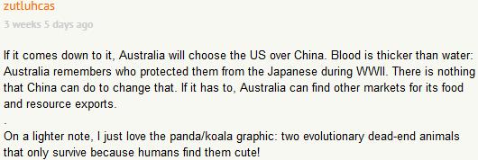 其实说到最后,澳大利亚还是会选择美国,而不是中国。毕竟,血浓于水。澳大利亚当然记得二战时是谁帮自己战胜了日本人,中国人无论如何也改变不了这一点。如果需要的话,澳大利亚完全可以避开中国,为自己的食品和资源选择其他的出口市场。最后说点轻松的,我很喜欢文中这幅熊猫和考拉的图,这两个不再进化的物种能存活至今,靠的完全是在人类面前卖萌。