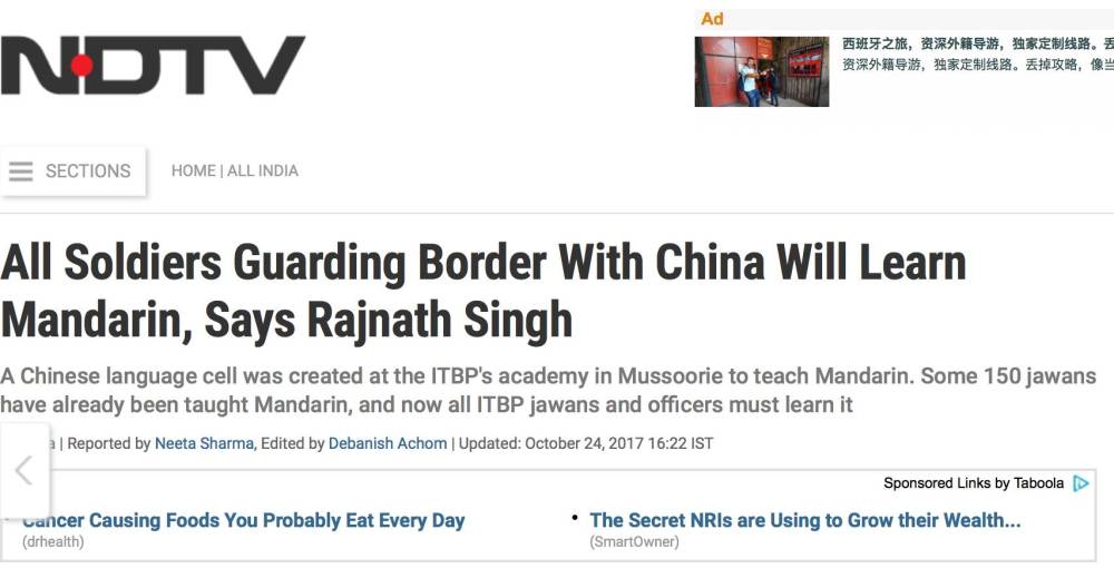 印媒称,总兵力约为9万人的印藏边境部队部署在近3500公里长的中印边境,经常与中国军队打交道,而该部队仅有少数高级军官懂中文。今年早些时候,印藏边境部队位于北阿坎德邦的穆索里学院开设中文课,目前约有150名官兵已通过课程培训。随着辛格一声令下,所有官兵都要学中文。
