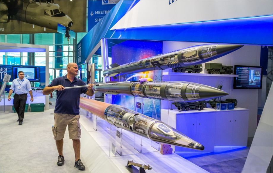 图为洛克希德-马丁公司防空系统展台,一名工作人员正在为导弹模型清扫作业。