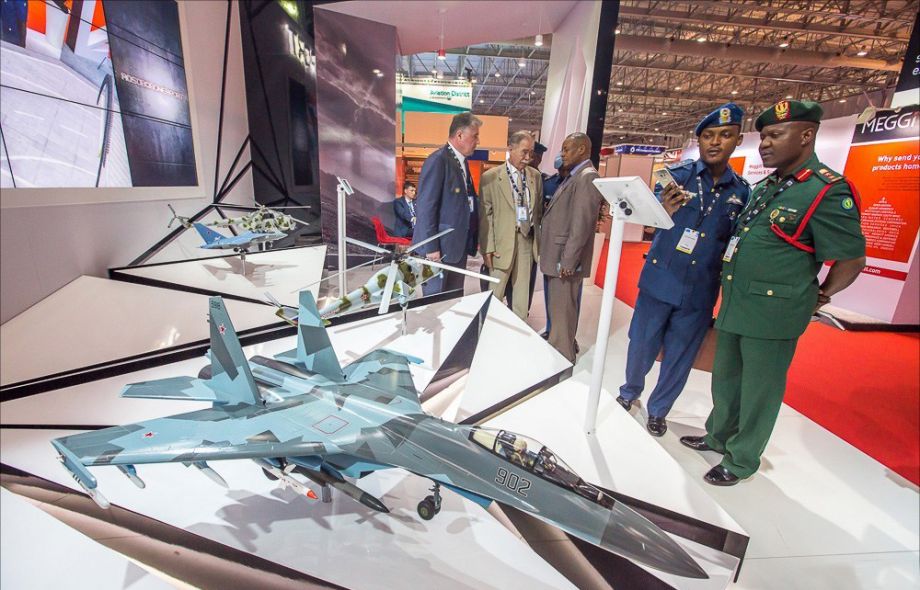 航展上的俄罗斯军机展台,图中可见精致的苏-35S战斗机模型。
