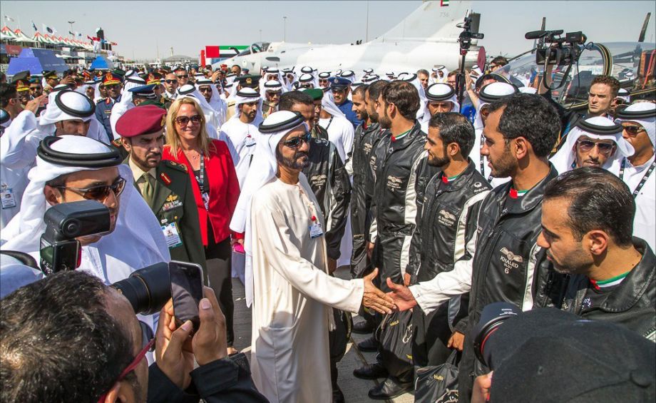图为阿联酋高层官员与”阿联酋骑士队“飞行员们握手致意。