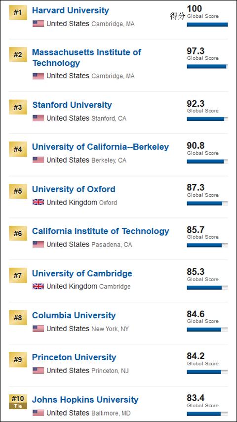 据报道,榜单中排名前10的12所大学中(其中3所并列第10),有10所是美国大学,另外2所则为英国的牛津大学和剑桥大学。它们按排名分别是:哈佛大学、麻省理工学院、斯坦福大学、加州大学伯克利分校、牛津大学、加州理工学院、剑桥大学、哥伦比亚大学、普林斯顿大学以及并列第10的约翰霍普金斯大学、华盛顿大学和耶鲁大学。