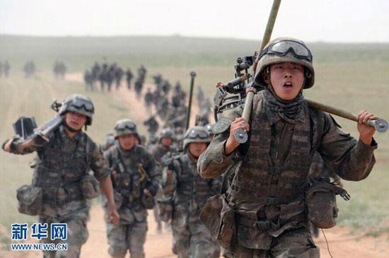 朱日和“跨越”演习中进行全员全装10公里越野的解放军官兵