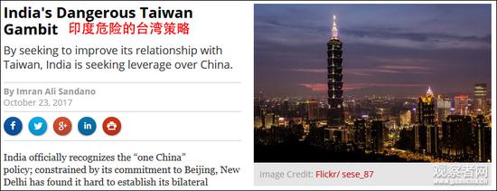 据《参考消息》报道,美国外交学者网站于本月23日发表了一篇题为《印度危险的台湾策略》的文章,表示印度不满中巴经济走廊,试图利用台湾问题作为对付中国的战略牌。