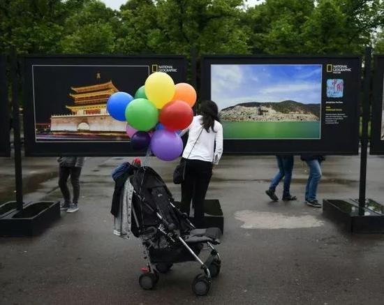 资料图片:2016年6月9日,在俄罗斯首都莫斯科高尔基文化公园,一名女子观看“美丽中国·大型丝路旅游图片展”。(新华社)