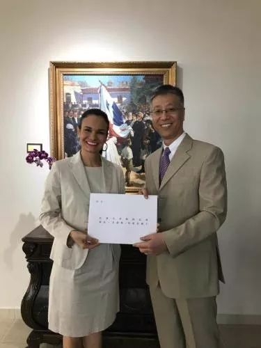 ▲当地时间10月23日,中国首任驻巴拿马特命全权大使魏强向巴拿马副总统兼外交部长德圣马洛递交国书副本。(中国驻巴拿马大使馆网站)