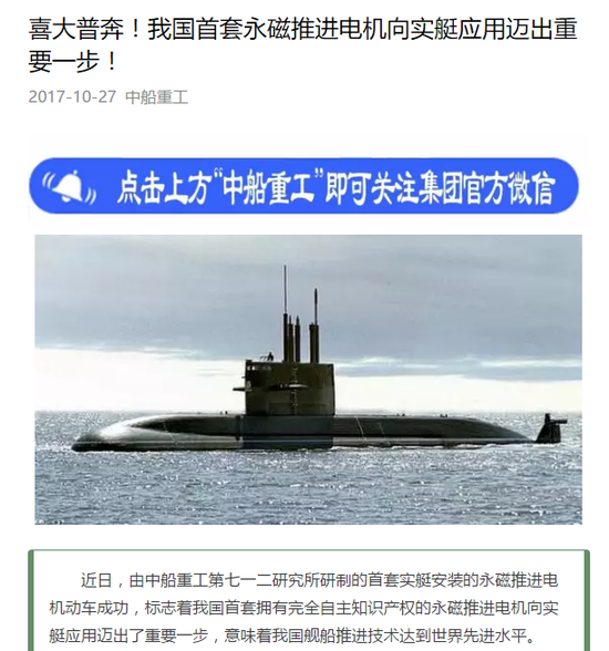 本周,10月23日,中船重工官方微信平台发布消息《我国首台艇用永磁推进电机动车成功,具有完全自主知识产权》,文中透露,我国第一台完全自主知识产权的永磁电机近日在三亚装艇试车成功,三亚驻有我国海军常规动力和核潜艇部队。现代舰艇用永磁电机是上世纪80年代开始运用的一种新技术,使用稀土材料制造的高性能永磁材料取代了传统直流电机的励磁原理,具有功率密度大、噪音小等特点。我国90年代开始推进进行这方面研制工作,是实现我国舰船动力跨越式发展的重要步骤。
