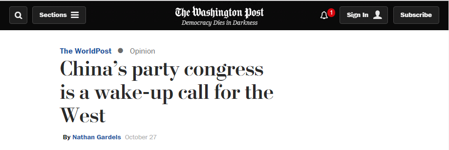 美国《华盛顿邮报》网站10月27日刊登题为《中国的党代会为西方敲响警钟》的文章称,如果政治自由的代价是分裂和分化,那么为了得到这种自由而付出的机会成本将极其巨大。当被民粹主义运动和分裂主义运动撕裂的西方陷入内部争执时,中国正勇敢地大步向前。