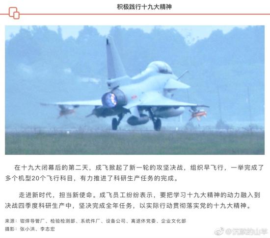 在十九大闭幕后的第二天,成飞掀起了新一轮的攻坚决战,组织早飞行,一举完成了多个机型20个飞行科目,有力推进了科研生产任务的完成。
