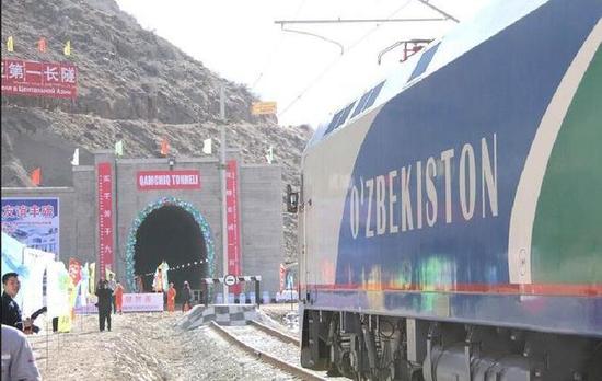 资料图:在乌兹别克斯坦安格连至帕普铁路卡姆奇克隧道贯通剪彩仪式现场