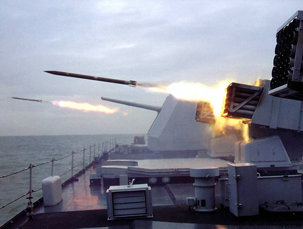 516“九江”号火力支援舰发射火箭炮。