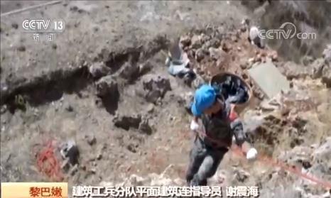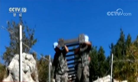 建筑工兵分队平面建筑连指导员 谢震海:我们每天要背着30公斤重的东西,在这500多米的崎岖小道上往返10多趟,一个月下来,肩膀和背上也磨出了血泡,但没有一个人喊苦叫累。
