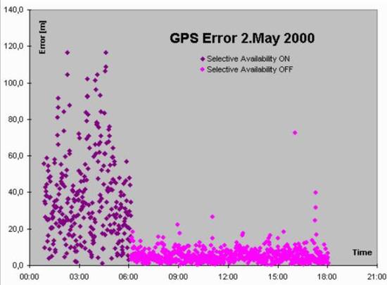 ¡¡¡¡ÔÚÃÀ¹úGPSÒ»¼Ò¶À´ó֮ʱ£¬ÃÀ¹ú¾ü·½ÔÚËùÓÐÃñÓÃÐźÅÉÏ·ÅÁ˸ÉÈÅ¡£ºóÀ´¶íÂÞ˹¸ñÂåÄÉ˹£¨GLONASS£©ÏµÍ³³öÏÖ£¬ÃÀ¹úΪÁËÓ¦¶Ô¾ºÕù²ÅÈ¡ÏûÁËÕâ¸ö¸ÉÈÅ£¨2000Äê5ÔÂ2ÈÕ£©¡£´ÓͼÖпÉÒÔ¿´³ö£¬È¡Ïû¸ÉÈźó£¬ÃñÓÃÐźŵĶ¨Î»¾«¶ÈÖ±½Ó´Ó°ÙÃ×¼¶Ìá¸ßµ½Á˽ñÌìµÄÃ×¼¶¡£