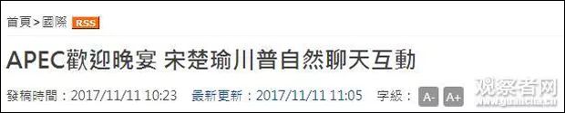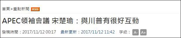 多家台媒将此作为标题进行报道。台湾东森新闻云12日还报道称,宋楚瑜不时隔着泰国总理巴育,“与特朗普聊上两句”,特朗普“离场前也不忘跟宋楚瑜、宋镇迈(宋楚瑜女儿)合影留念”。
