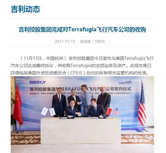 11月13日,这桩漫长的谈判终于尘埃落定。吉利控股集团宣布与美国Terrafugia飞行汽车公司达成最终协议,将收购Terrafugia的全部业务及资产。此项交易已获得包括美国外资投资委员会(CFIUS)在内的所有相关监管机构的批准。