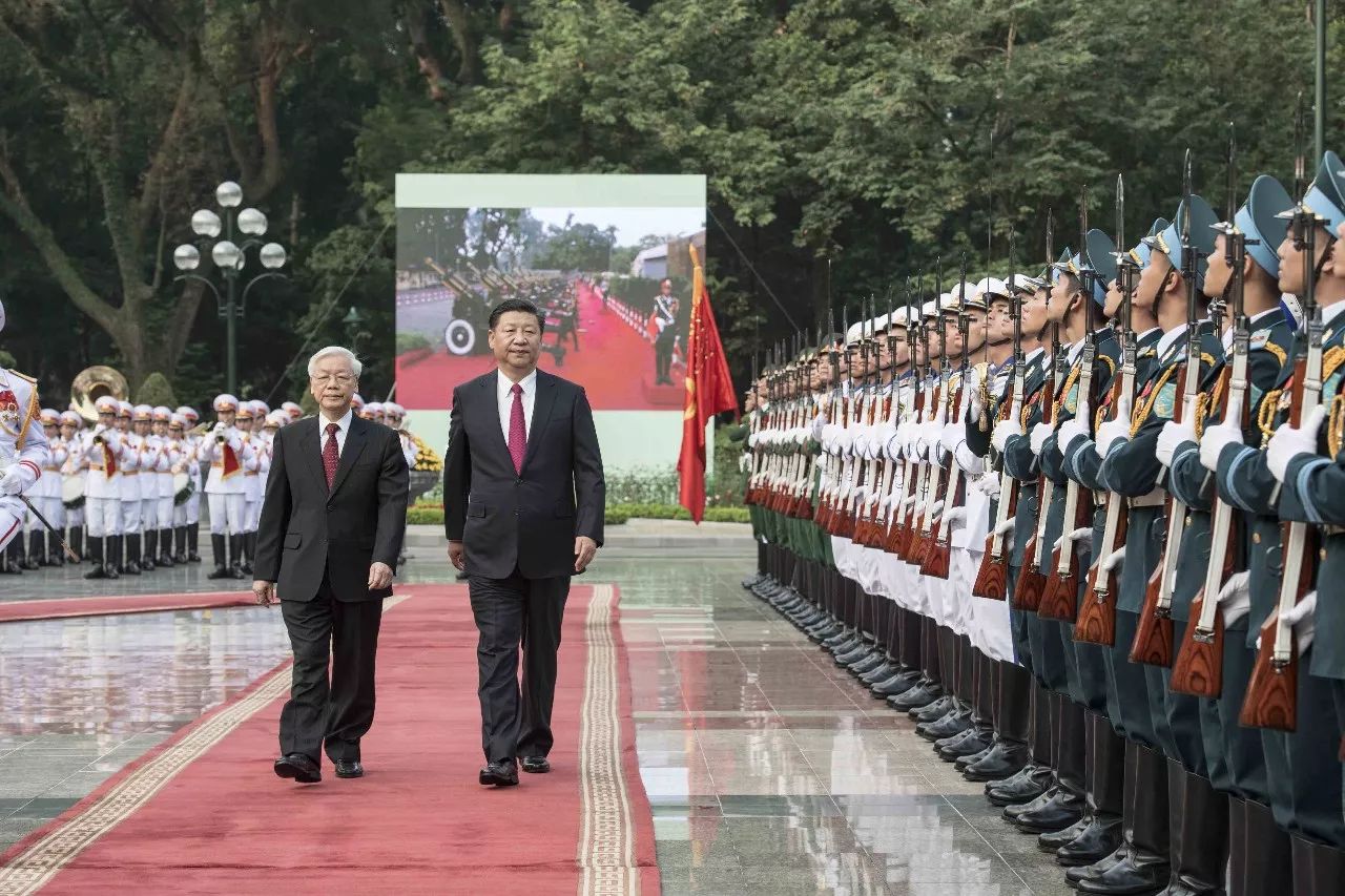 ▲11月12日,中共中央总书记、国家主席习近平在河内越共中央驻地同越共中央总书记阮富仲举行会谈。会谈前,阮富仲在主席府广场为习近平举行盛大欢迎仪式。
