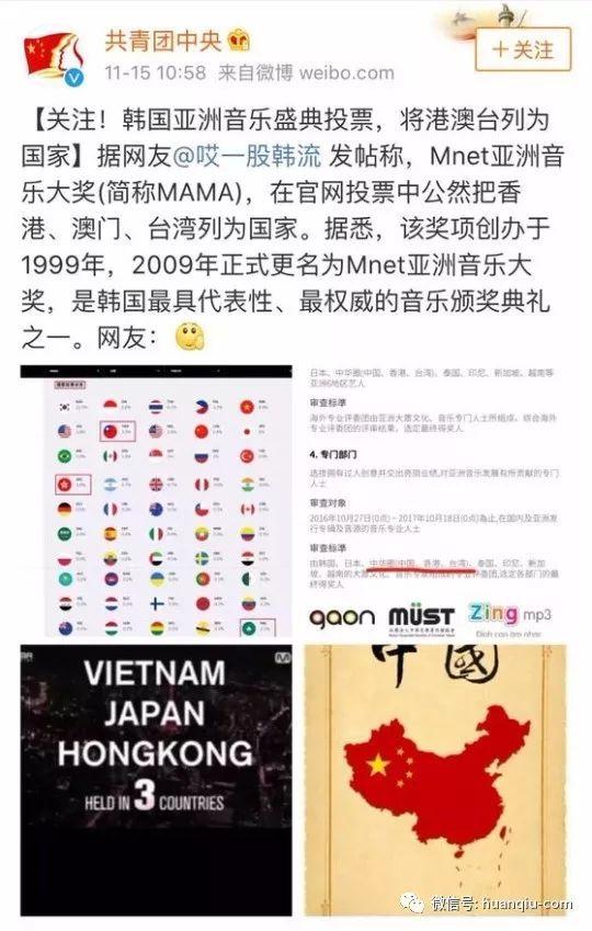 昨天,环环推送了这样一篇文章?韩国辛辛苦苦几个月的外交成果,可能因为它打水漂。。。,说的是韩国年度音乐颁奖礼Mnet亚洲音乐大奖(简称MAMA)在官网投票页面(包括中文、韩文、日文、英文页面)中,竟把港澳台列为国家,遭到中国内地网友的抵制,“mama滚出中国”15日登上微博热门话题。