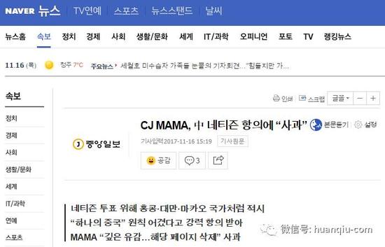 韩国《中央日报》: MAMA就中国网民抗议致歉