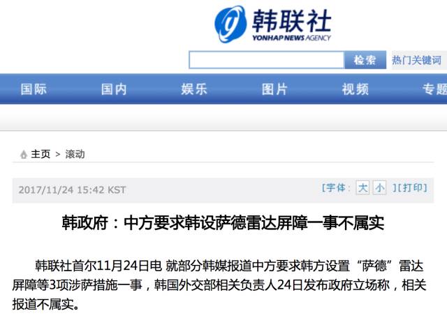 韩国《中央日报》24日刊发多篇报道,引述匿名韩国政府高官的话称,中国提议就“萨德”问题早日进行中韩军事磋商,还对“萨德”提出三个要求,包括对“萨德”雷达设立隔离墙,以防止探测中国腹地。韩国政府24日否认上述说法。中国军事专家杨承军24日评价,韩媒所谓中国的三大要求“幼稚可笑”,根本没有可操作性。