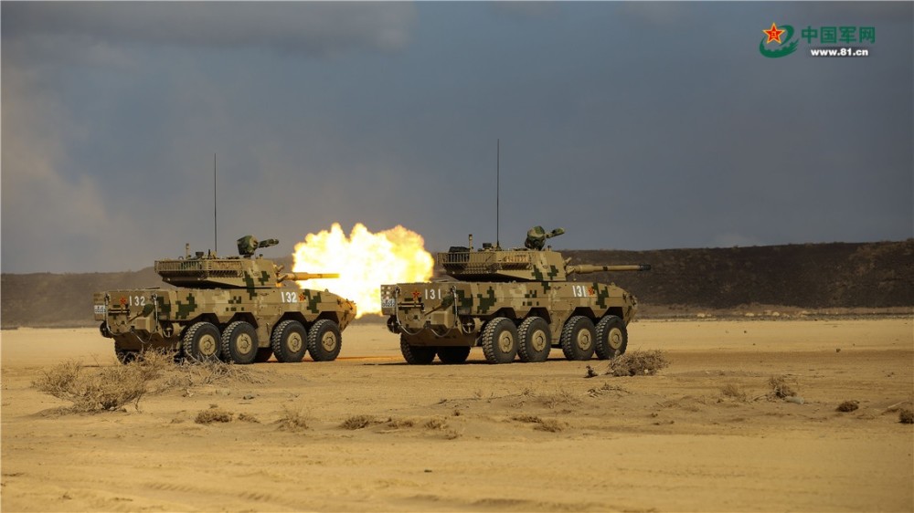 中国国家电视台中央电视台播放的画面显示,轮式装甲突击车和步战车在沙漠中投入演练,军人们在进行目标打击训练。据报道,训练主要包括火炮实弹射击训练和通信设备操作等。