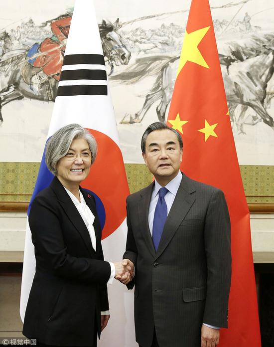 据新华社报道,外交部长王毅22日在北京同韩国外长康京和举行会谈。王毅表示,中方重视韩方关于不追加“萨德”系统、不加入美国反导体系、不发展韩美日三方军事同盟的“三不”表态以及无意损害中方安全利益的表态,希望韩方继续妥善处理“萨德”问题。中韩双方应共同努力,进一步增进相互了解,最大限度减少分歧,为两国关系全面恢复发展创造条件。