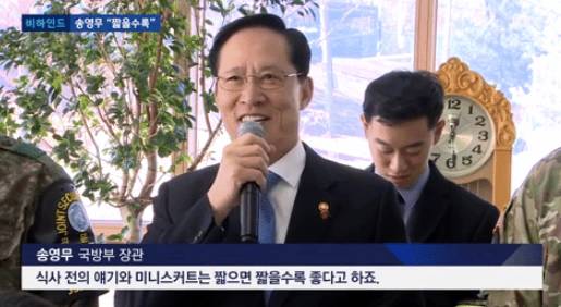 据韩国《中央日报》报道,宋永武27日与士兵共进午餐,他在饭前发言时,笑称:“人们说,演说和迷你裙都是愈短愈好,对不对?”士兵随即士气大增地说:“是的,长官!”