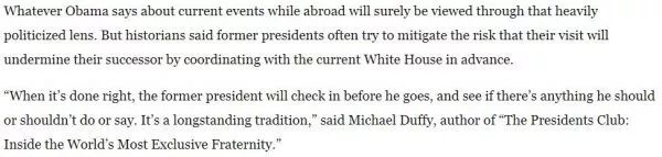 《华盛顿邮报》则通过梳理美国历史上多位卸任总统的海外访问,给出了更详尽的剖析。
