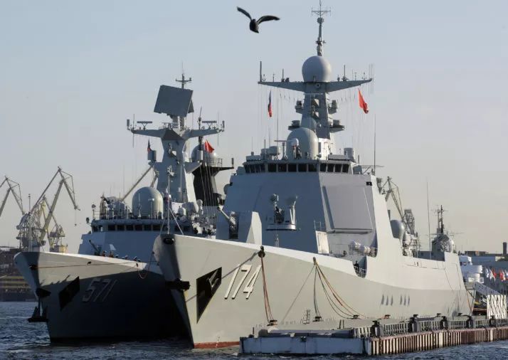 ▲资料图片:2017年7月27日,中国海军导弹驱逐舰合肥舰(右)、导弹护卫舰运城舰抵达俄罗斯圣彼得堡。至此,中俄“海上联合-2017”军事演习第一阶段落下帷幕。(法新社)