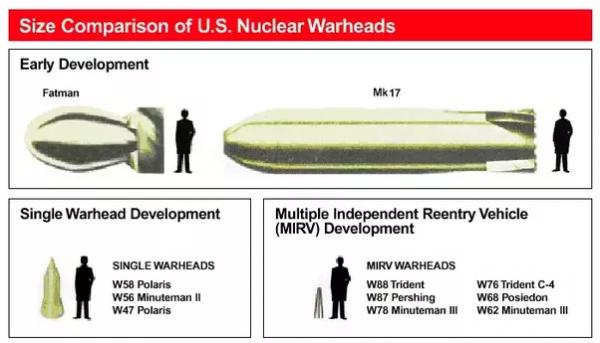 美国核弹头尺寸示意图,朝鲜现在具备把弹头做到左下角这样尺寸的能力,当然,威力比主要大国的热核弹头小了2、3个数量级,至于左下角的现代化小型核武器,肯定已经超出朝鲜技术能力