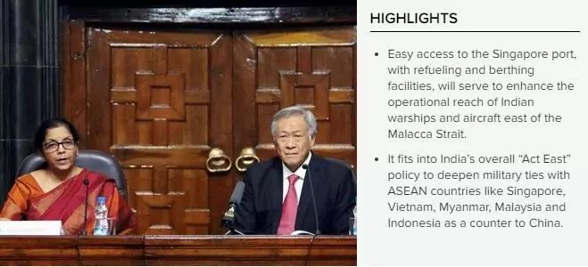 报道认为,能够方便地在新加坡港口加油和停泊将有助于增强印度军舰和飞机在马六甲海峡以东的行动能力,马六甲海峡是中国日益扩展的能源供应的必经之路。报道声称,加强与新加坡、越南、缅甸、马来西亚和印度尼西亚等东盟国家的军事联系以抗衡中国,符合印度整体的“向东行动”政策。