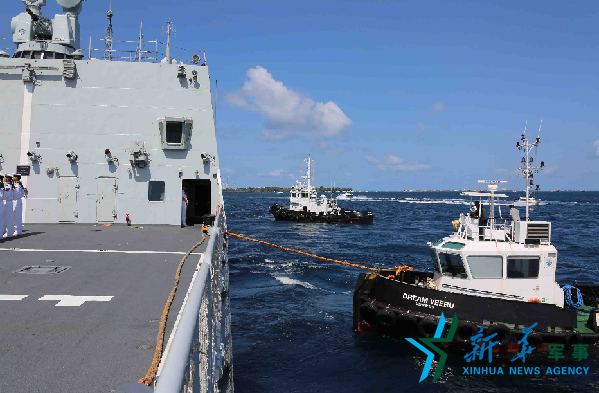 中国海军远航访问编队长春舰在马方的拖船牵引下,缓缓向马累港码头靠近。新华社记者 许寿明 摄