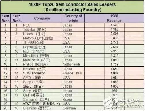需要注意,在1988年的榜单中,韩国三星首次杀入全球半导体TOP20。