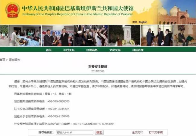 ▲12月8日,中国驻巴基斯坦大使馆发布消息称,恐怖分子策划近期对中国驻巴基斯坦机构和人员发动系列恐袭 ,提醒在巴中资机构和中国公民提高安防意识。