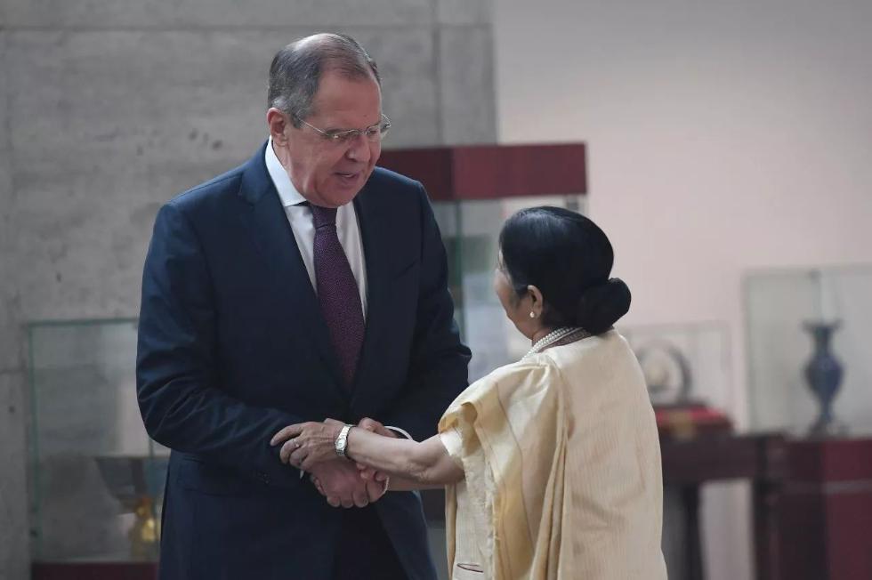 12月11日,在印度首都新德里,俄罗斯外长拉夫罗夫(左)与印度外长斯瓦拉杰握手。法新社