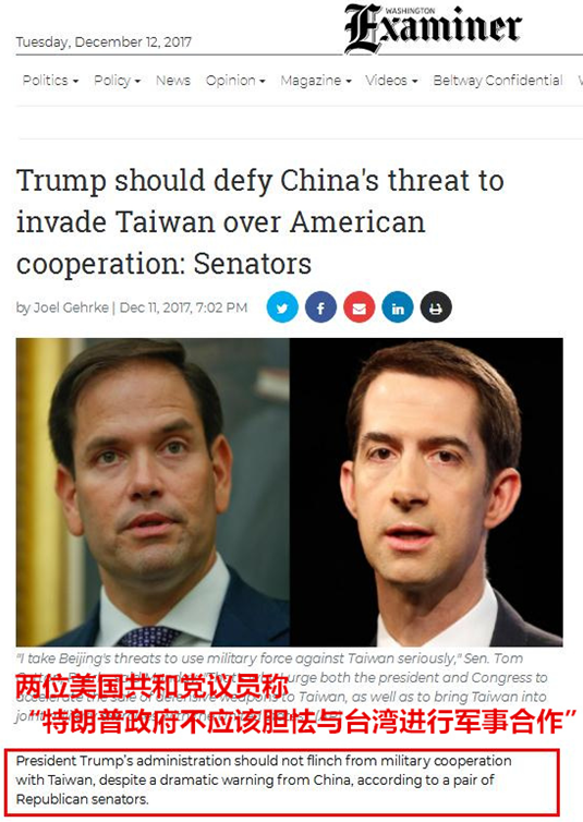 “我很认真看待中国或使用武力对待台湾的威胁言论。”美国参议员汤姆·柯顿11日表示,“为此我敦促总统与国会加速对台销售防御性武器,并让台湾参与到与美国的联合军演当中。”柯顿希望美国帮助台湾做好军备。“轻视北京的武力威胁,我们可承担不起。”他说。
