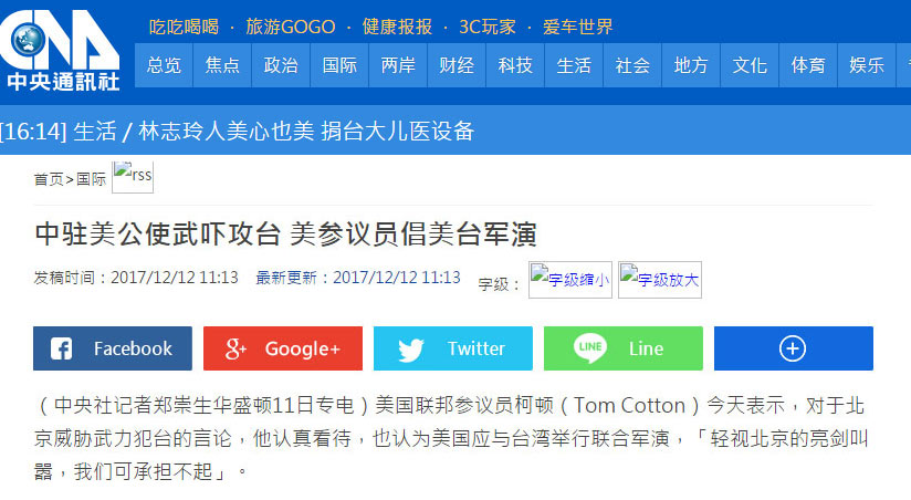 台湾“中央社”12日报道截图