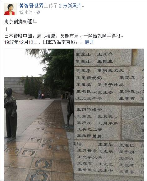 黄智贤今日在脸书发文称,1937年的南京大屠杀到今天(13日)刚好80周年,唤起许多中国人的伤痛记忆,但这件事在台湾已越来越少被提到,似乎与己无关。