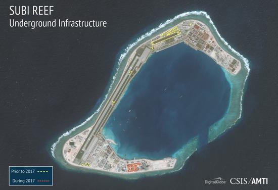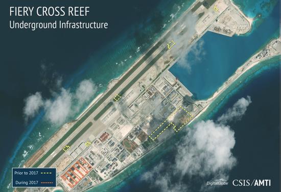 虚线框为AMTI判断的地下设施,其中橙色部分为2017年内建筑(图片来源:AMTI)
