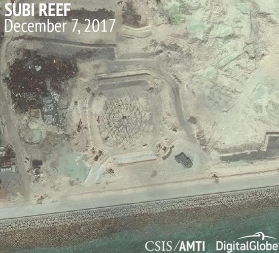 今年12月7日的卫星照片,AMTI用红色标注的2017年内渚碧礁新建设施(图片来源:AMTI)