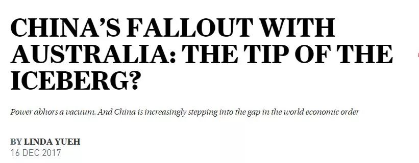 文章称,随着北京对全球经济的影响增强,以及华盛顿在实施“美国优先”政策过程中影响减弱,类似于中澳之间的政治失和将是预料之中的。
