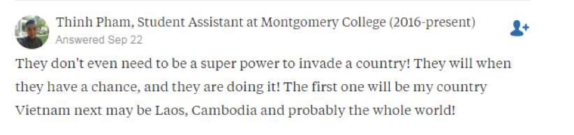 他上来就说:“中国不需要等到成为超级大国就可以入侵别国!他们只要有机会就会这么做,现在也正在这么做!首当其冲被侵略的就会是我们越南,接下来是老挝、柬埔寨,还可能是整个世界!”