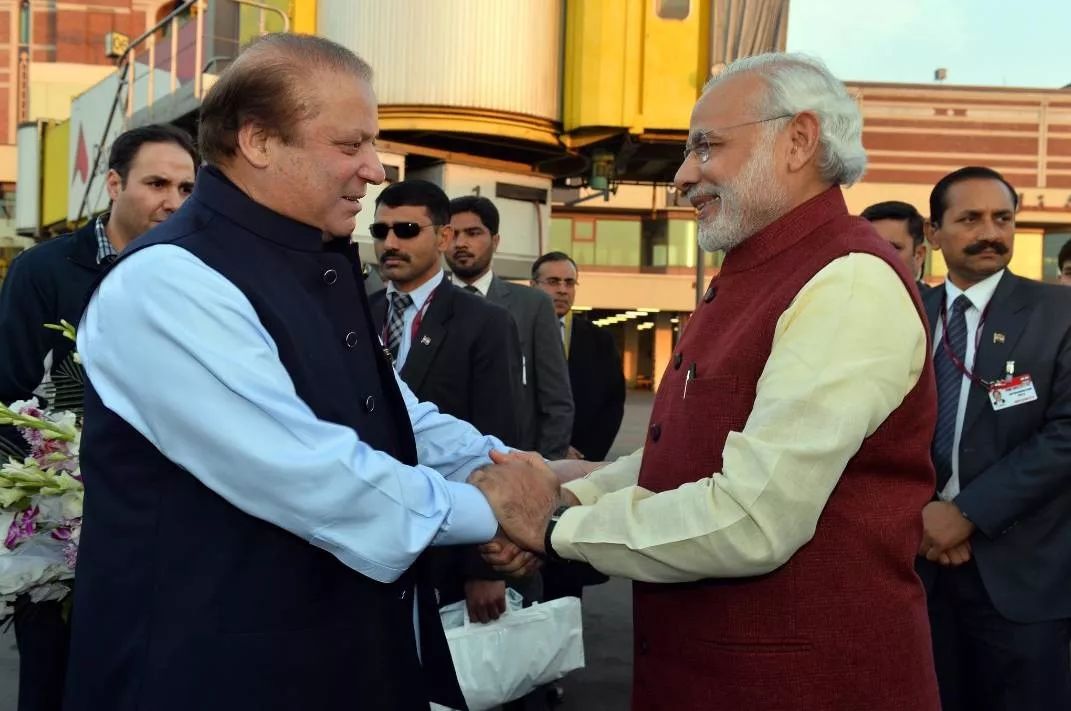 ▲资料图片:2015年12月25日,莫迪突访巴基斯坦,与时任巴总理谢里夫短暂会面。(印度新闻信息局)