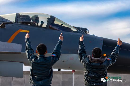 “金头盔-2017”空军对抗空战竞赛考核,战机滑出,飞行员为战友鼓劲加油。杨盼 摄影