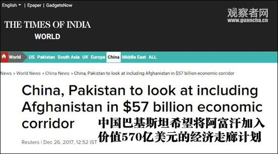 英国路透社对此次中阿巴三国外长对话的报道就提到了,这项计划是巴基斯坦为了打击老对手印度在阿富汗的影响。同时还强调印度反对这项将克什米尔地区囊括在内的经济项目。