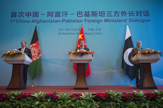 中阿巴三国外长在记者会上表示,将致力于加强彼此间关系,深化互利合作,推进在“一带一路”框架下的互联互通,不加区别地打击一切形式的恐怖主义。为地区国家和国际社会全面支持的广泛包容的和平和解进程,是在阿富汗结束暴力的最现实途径。